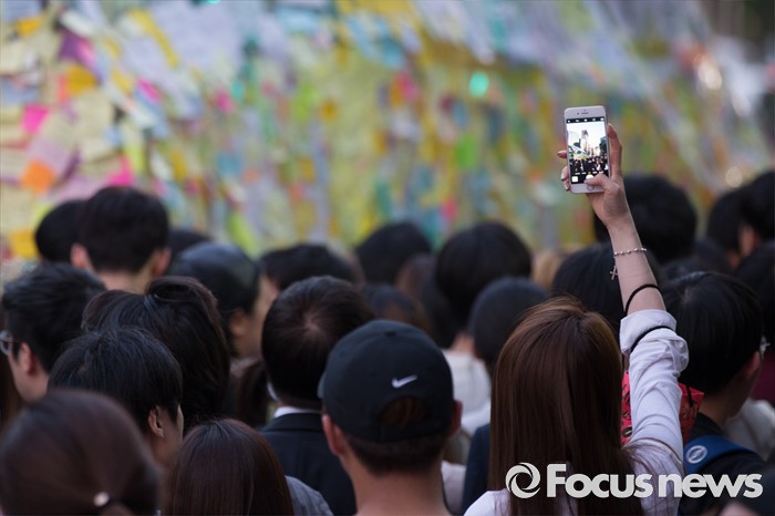 (서울=포커스뉴스) 19일 오후 서울 서초구 강남역 10번출구에서 시민들이 '강남 묻지마 살인' 피해자를 추모하고 있다.