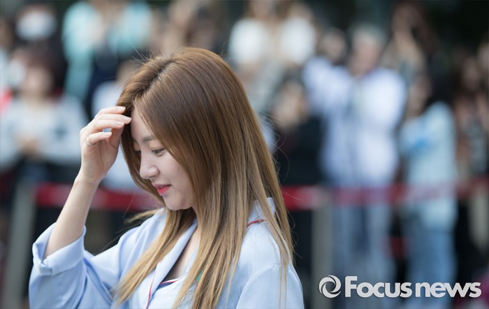 (서울=포커스뉴스) 20일 오전 서울 영등포구 KBS에서 생방송 뮤직뱅크 리허설에 참여한 걸그룹 라붐의 해인이 머리카락을 정돈하고 있다.