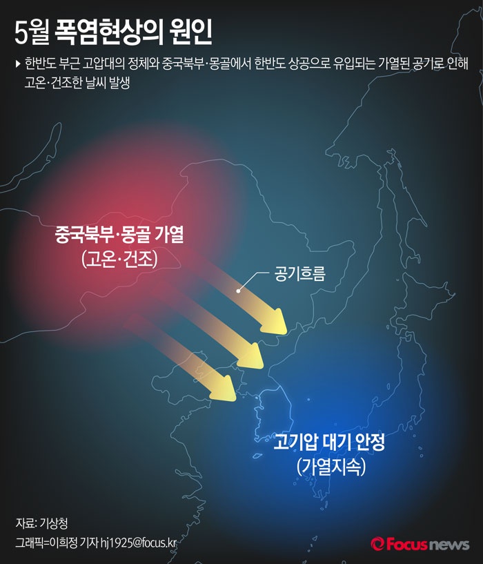 (서울=포커스뉴스) 19일 기상청은 고온·건조한 날씨가 5월 23일까지 지속될 것으로 예상했다. 5월에 발생하는 이상고온은 한반도 부근 고압대의 정체와 중국북부·몽골에서 한반도 상공으로 유입되는 가열된 공기때문으로 밝혀졌다.