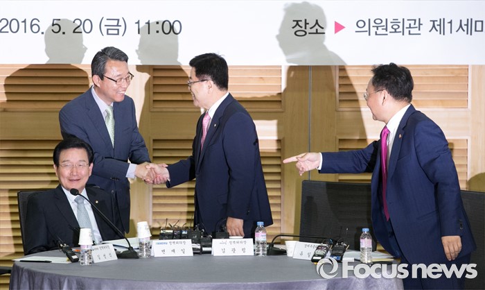 (서울=포커스뉴스) 20일 오전 서울 여의도 국회 의원회관에서 열린 1차 민생경제현안점검회의에 참석한 3당 정책위의장과 유일호 경제부총리 겸 기획재정부 장관이 인사하고 있다. 왼쪽부터 변재일 더불어민주당 정책위의장, 김성식 국민의당 정책위의장, 김광림 새누리당 정책위의장, 유 부총리.
