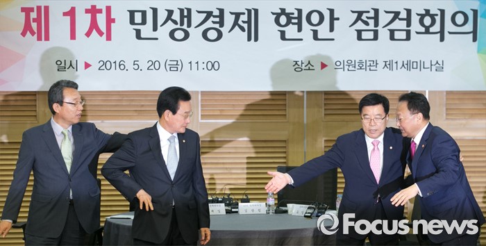 (서울=포커스뉴스) 20일 오전 서울 여의도 국회 의원회관에서 열린 1차 민생경제현안점검회의에 참석한 3당 정책위의장과 유일호 경제부총리 겸 기획재정부 장관이 취재진을 향해 포즈를 취하고 있다. 왼쪽부터 김성식 국민의당 정책위의장, 변재일 더불어민주당 정책위의장, 김광림 새누리당 정책위의장, 유 부총리.