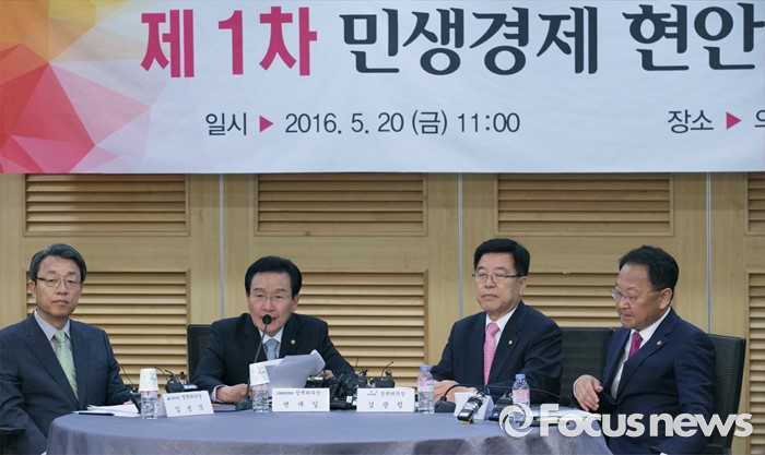 (서울=포커스뉴스) 20일 오전 서울 여의도 국회 의원회관에서 열린 1차 민생경제현안점검회의에 참석한 변재일 더불어민주당 정책위의장이 모두발언을 하고 있다. 왼쪽부터 김성식 국민의당 정책위의장, 변재일 더불어민주당 정책위의장, 김광림 새누리당 정책위의장, 유일호 경제부총리 겸 기획재정부 장관.