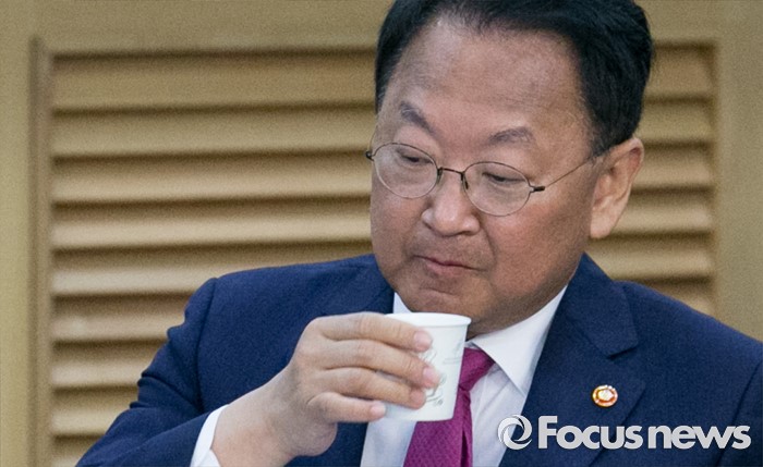 (서울=포커스뉴스) 20일 오전 서울 여의도 국회 의원회관에서 열린 1차 민생경제현안점검회의에 참석한 유일호 경제부총리 겸 기획재정부 장관이 물을 마시고 있다.
