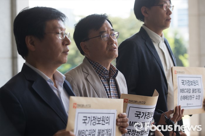 (서울=포커스뉴스) 전국언론노동조합이 MBC파업 개입 국정원 고소 및 손해배상 청구 관련 고발장 접수를 위해 20일 오전 서울중앙지방검찰청으로 들어가기 전 기자회견을 하고 있다.