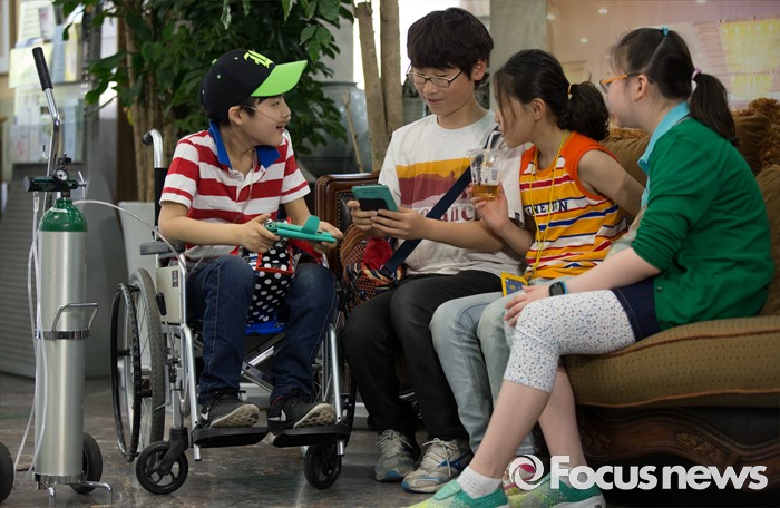 (대전=포커스뉴스) 아타 사프달 옥시레킷벤키저 대표와 임원진이 20일 오후 대전 유성구 아드리아호텔에서 옥시의 가습기 살균제 제품 피해자와 면담을 마련한 가운데 피해 어린이들이 핸드폰 게임을 하고 있다.