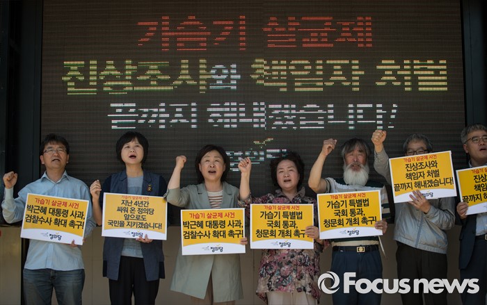 (서울=포커스뉴스) 심상정(왼쪽 세번째) 정의당 대표와 가습기 살균제 피해자들이 20일 오전 서울 여의도역 사거리 앞에서 가습기 살균제 참사 관련 대국민 캠페인 선포식을 하고 있다.