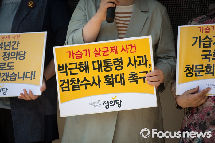 (서울=포커스뉴스) 심상정 정의당 대표와 가습기 살균제 피해자들이 20일 오전 서울 여의도역 사거리 앞에서 가습기 살균제 참사 관련 대국민 캠페인 선포식을 하고 있다.