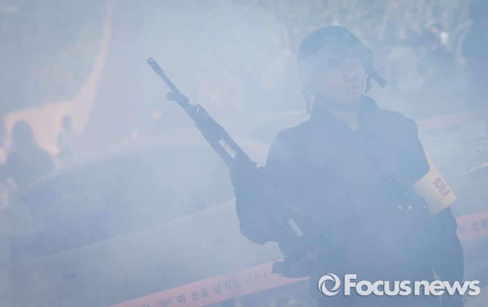 (서울=포커스뉴스) 20일 오후 서울 강남구 코엑스에서 열린 '2016 재난대응 안전한국훈련'에 참여한 훈련병력들이 테러대응훈련을 펼치고 있다.