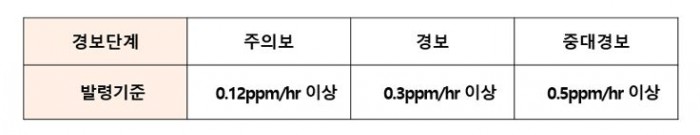 서울시는 오존주의보가 발령됐을 경우 실외운동이나 산책 등 야외활동과 자동차 운행을 자제하고, 도장작업이나 휘발성 유기화합물(VOC)이 배출되는 작업장에서는 햇빛이 강한 오후 2시부터 5시까지는 작업을 피해줄 것을 당부하고 있다.오존 주의보․경보 발령 기준(1시간 평균농도 기준) <표제공=서울시청>
