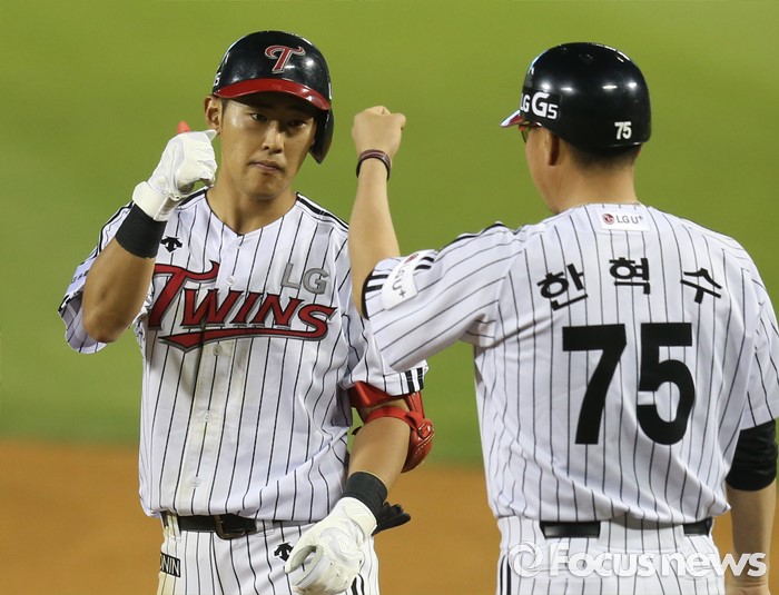 (서울=포커스뉴스) 20일 서울 잠실구장에서 열린 2016 프로야구 넥센-LG 경기 5회말 1사 2,3루에서 LG 정주현이 2타점 중전 안타를 치고 한혁수 코치의 축하를 받고 있다.