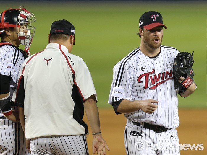△ 교체돼 마운드 내려가는 LG 코프랜드
