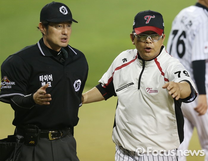 (서울=포커스뉴스) 20일 서울 잠실구장에서 열린 2016 프로야구 넥센-LG 경기 8회말 1사후 LG 양상문 감독이 나광남 주심에게 동점 3루타를 친 정성훈의 대주자를 내보내고 있다.