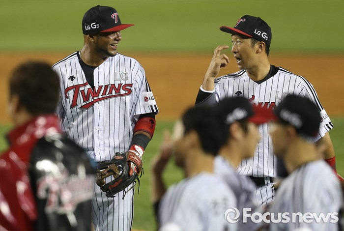 (서울=포커스뉴스) 20일 서울 잠실구장에서 열린 2016 프로야구 넥센-LG 경기에서 역전승한 LG의 이병규와 히메네스가 승리의 기쁨을 함께하고 있다.