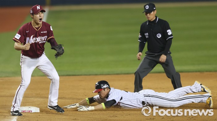 (서울=포커스뉴스) 20일 서울 잠실구장에서 열린 2016 프로야구 넥센-LG 경기 8회말 무사 2루에서 LG 대타 손주인의 희생번트때 2루주자 임훈이 3루에서 슬라이딩하며 세이프되고 있다.