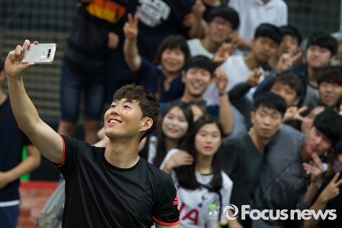 (서울=포커스뉴스) 손흥민이 20일 오후 서울 용산구 아이파크몰 풋살경기장에서 열린 아디다스 손흥민 팬미팅 및 사인회에서 팬들과 셀카를 찍고 있다.