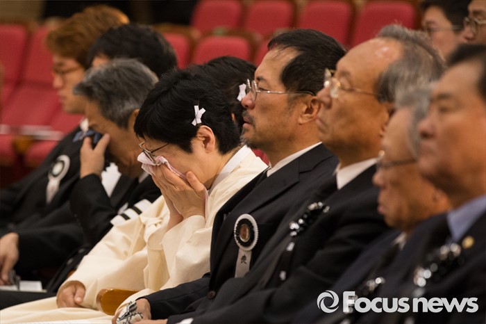 (서울=포커스뉴스) 21일 오전 서울 여의도 국회에서 엄수된 故 김재순 전 국회의장 국회장 영결식에 유가족들이 눈물을 흘리고 있다.