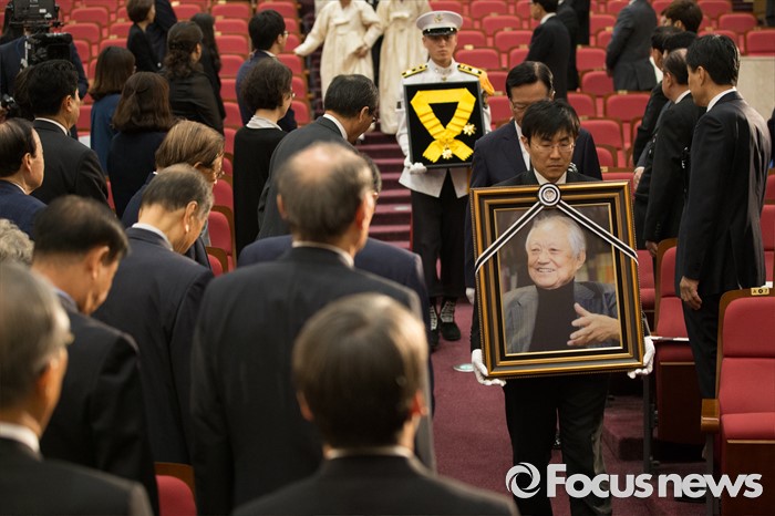 (서울=포커스뉴스) 21일 오전 서울 여의도 국회에서 엄수된 故 김재순 전 국회의장 국회장 영결식에 고인의 영정사진과 유가족들이 입장하고 있다.