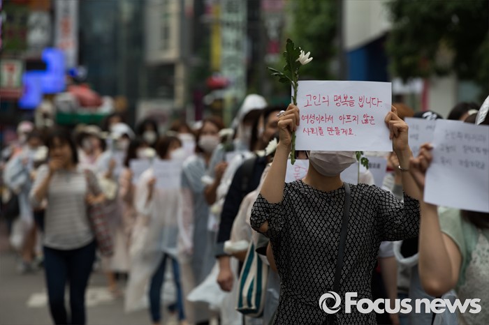 (서울=포커스뉴스) 21일 오후 서울 서초구 강남역 10번 출구 인근에서 시민들이 '강남역 여성혐오 살인사건 추모 집회'에 참석해 행진하고 있다.