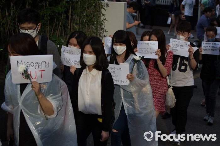 (서울=포커스뉴스) 21일 오후 서울 서초구 강남역 10번 출구 인근에서 시민들이 '강남역 여성혐오 살인사건 추모 집회'에 참석해 행진하고 있다.