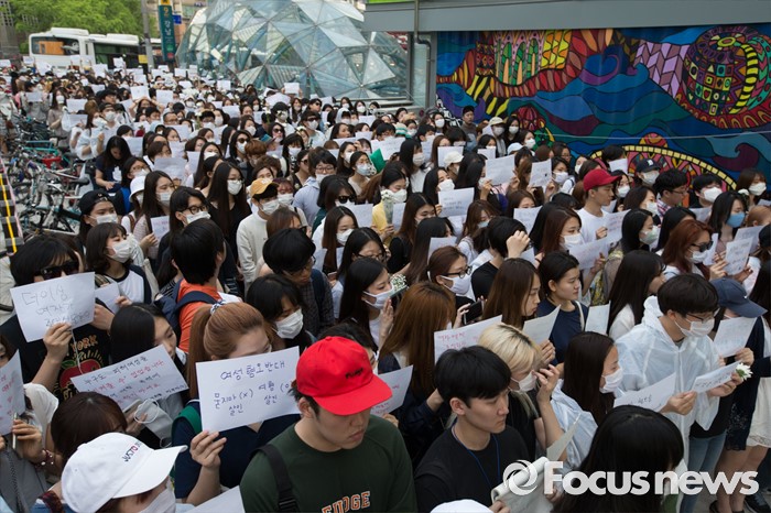 (서울=포커스뉴스) 21일 오후 서울 서초구 강남역 10번 출구 인근에서 시민들이 '강남역 여성혐오 살인사건 추모 집회'에 참석해 행진을 마친 뒤 피켓을 들고 있다.