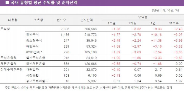 중소형주식펀드가 중소형주 약세로 2.49% 하락하며 국내 주식형펀드 중 가장 부진한 성과를 기록했다. 배당주식펀드와 일반주식펀드도 각각 1.58%, 1.77% 하락한 것으로 집계됐다.