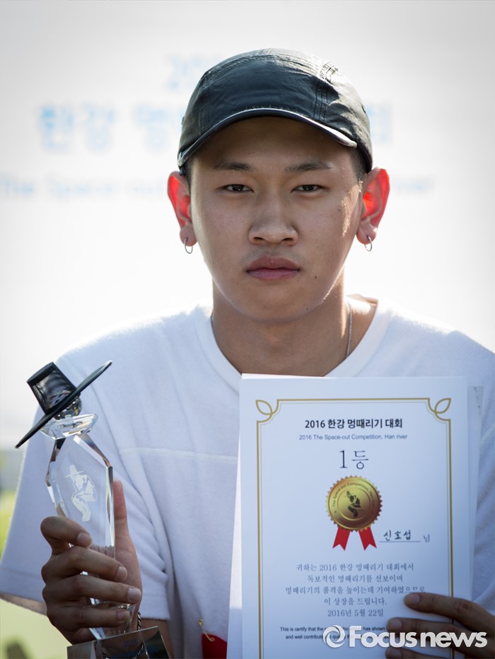 (서울=포커스뉴스) 22일 오후 서울 용산구 이촌 한강공원에서 열린 '한강 멍때리기 대회'에 참가해 1등을 수상한 래퍼 크러쉬가 멍한 표정으로 상장과 트로피를 들고 있다.