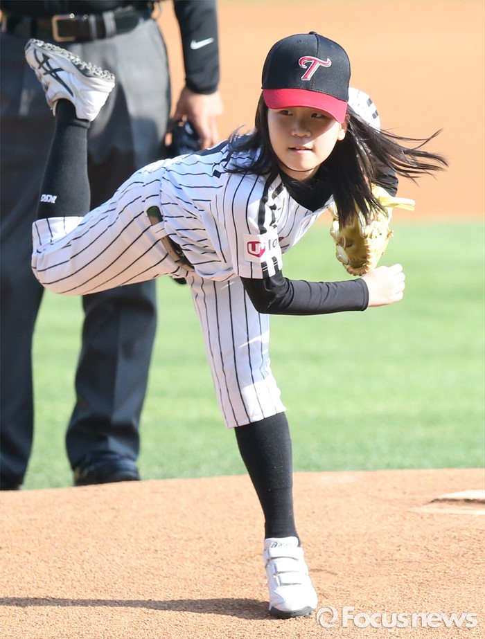 (서울=포커스뉴스) 22일 서울 잠실구장에서 열린 2016 프로야구 넥센-LG 경기에서 여자 야구선수인 이유진 어린이가 시구하고 있다.