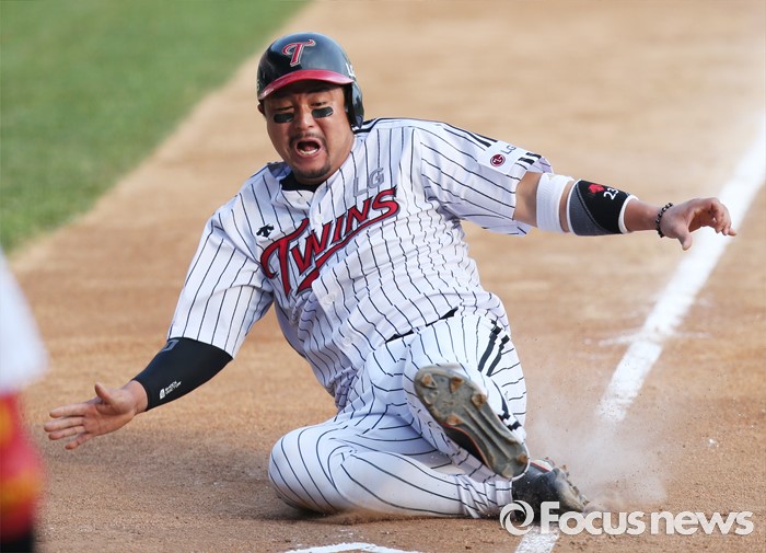 (서울=포커스뉴스) 22일 서울 잠실구장에서 열린 2016 프로야구 넥센-LG 경기 3회말 2사 1,2루에서 LG 임훈의 우전 안타때 2루주자 최경철이 홈까지 뛰어 슬라이딩하며 세이프되고 있다.