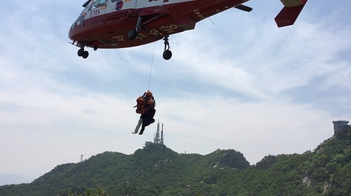 신고를 받고 출발한 소방당국은 홍씨를 응급처치 한 뒤 헬기로 구조해 인근 병원으로 이송했다.22일 오전 관악산 관악문 인근에서 실족한 등산객을 소방당국이 헬기로 구조하고 있다. <사진제공=119특수구조단 관악산 산악구조대>