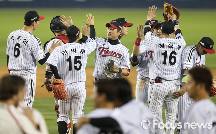(서울=포커스뉴스) 22일 서울 잠실구장에서 열린 2016 프로야구 넥센-LG 경기에서 넥센을 물리치고 위닝시리즈를 챙긴 LG 선수들이 마운드에 모여 하이파이브하며 승리의 기쁨을 함께 하고 있다.