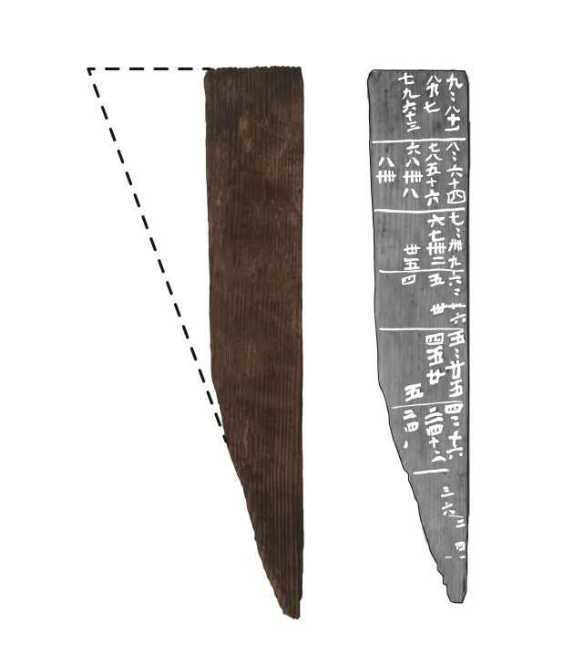 ☞목간(木簡): 반듯하게 다듬은 면에 먹으로 문자를 기록한 나무 조각.부여 쌍북리 유적 출토 구구단 목간.<사진제공=문화재청>