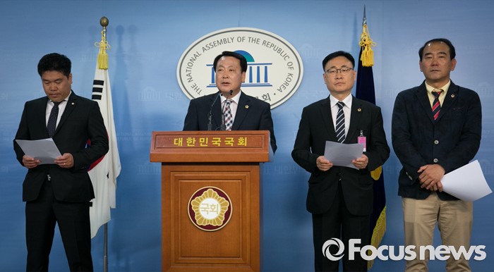 (서울=포커스뉴스) 23일 오전 서울 여의도 국회 정론관에서 임채호(왼쪽 두번째부터) 경기도의회 의원, 이광희 충북도의회 의원, 박재만 전북도의회 의원 등이 지방의원의 후원회 제한한 정치자금법 제6호에 대한 헌법소원심판 청구 기자회견을 하고 있다. 왼쪽 첫번째는 오동현 변호사.