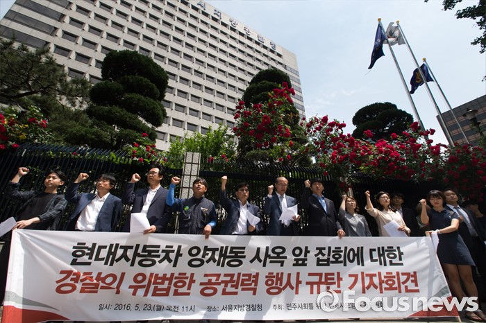 (서울=포커스뉴스) 민주사회를위한변호사모임과 유성기업 범시민대책위원회 등은 23일 오전 서울 종로구 서울지방경찰청 앞에서 '현대자동차 양재동 사옥 앞 집회에 대한 경찰의 위법한 공권력 행사 규탄 기자회견'을 열고 "재벌기업을 두둔하고 노동자를 탄압한 경찰의 위법행위를 좌시하지 않겠다"고 밝혔다.