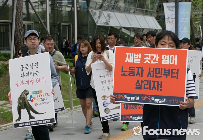 (서울=포커스뉴스) 23일 오전 서울 여의도 전국경제인연합회 앞에서 민주노총과 시민사회단체 등으로 구성된 재벌책임공동행동이 전경련 규탄 및 서울대행진 출발 기자회견을 마친 뒤 산업은행으로 이동하고 있다.