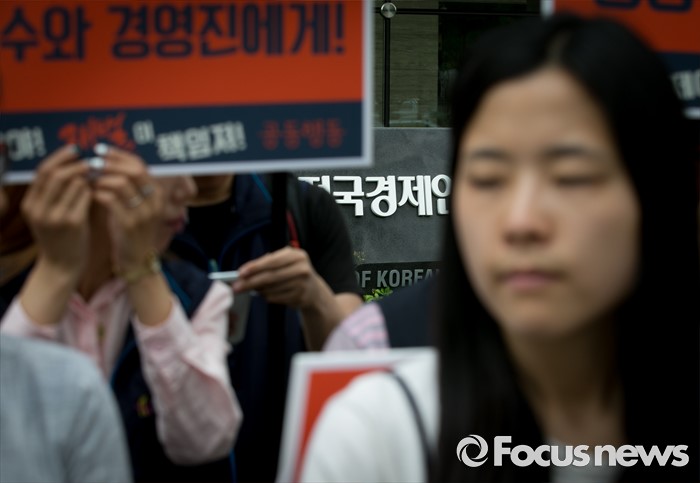 (서울=포커스뉴스) 23일 오전 서울 여의도 전국경제인연합회 앞에서 민주노총과 시민사회단체 등으로 구성된 재벌책임공동행동이 전경련 규탄 및 서울대행진 출발 기자회견을 하고 있다.