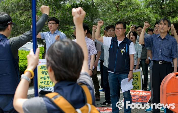 (서울=포커스뉴스) 23일 오후 서울 여의도 산업은행 본점 앞에서 민주노총과 시민사회단체 등으로 구성된 재벌책임공동행동이 규탄 및 서울대행진 출발 기자회견을 하고 있다.