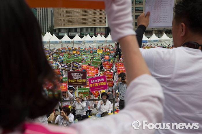 (서울=포커스뉴스) 23일 오후 서울 중구 시청광장에서 보육관계자들이 '어린이집 0~2세 맞춤형 보육제도 개선 및 시행 연기'를 촉구하며 결의대회를 하고 있다.