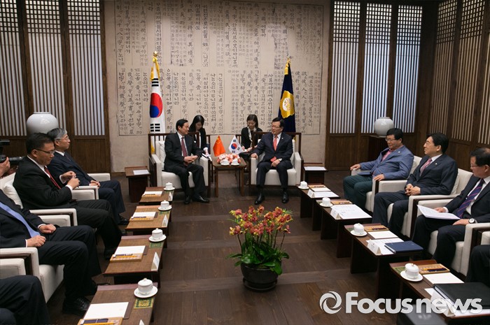(서울=포커스뉴스) 싱크탱크 '새 한국의 비전'을 준비 중인 정의화(오른쪽) 국회의장이 23일 오후 서울 여의도 국회에서 류치바오 중국 공산당 중앙선전부장을 접견, 면담을 하고 있다. 정 의장은 지난 19일 본회의를 마친 뒤 유승민 무소속 의원과 독대한 것으로 알려져 관심을 모으고 있다.