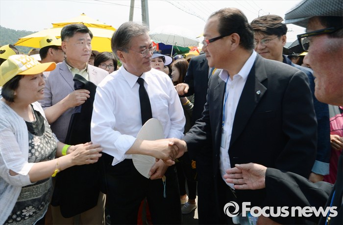 (김해=포커스뉴스) 23일 오후 경남 김해 봉하마을에서 엄수된 故 노무현 전 대통령 서거 7주기 추도식에 참석한 문재인 더불어민주당 전 대표가 시민들과 인사하고 있다.
