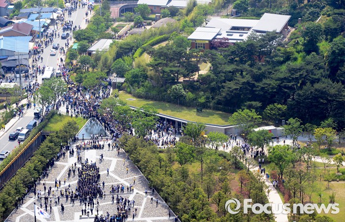 (김해=포커스뉴스) 23일 오후 경남 김해 봉하마을에서 엄수된 故 노무현 전 대통령 서거 7주기 추도식을 마친 뒤 참배객들이 헌화를 하고 있다.