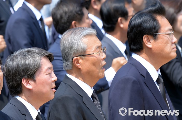 (김해=포커스뉴스) 23일 오후 경남 김해 봉하마을에서 엄수된 故 노무현 전 대통령 서거 7주기 추도식에 참석한 정진석(오른쪽부터) 새누리당 원내대표, 김종인 더불어민주당 비대위 대표, 안철수 국민의당 상임공동대표가 임을 위한 행진곡을 부르고 있다.