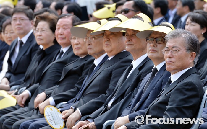 (김해=포커스뉴스) 23일 오후 경남 김해 봉하마을에서 엄수된 故 노무현 전 대통령 서거 7주기 추도식에 참석한 인사들이 추도식을 지켜보고 있다. 앞줄 오른쪽부터 문재인 더불어민주당 전 대표, 이병완 전 대통령 비서실장, 고영구 전 국정원장, 문희상 더불어민주당 의원, 이해찬 노무현재단 이사장, 임채정, 김원기 전 국회의장, 부인 권양숙 여사, 김홍걸 더불어민주당 국민통합위원장.