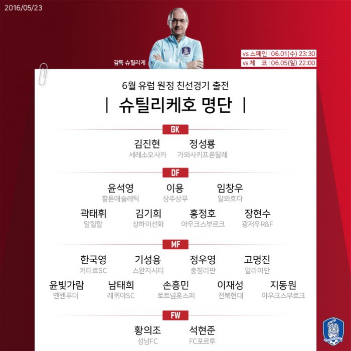 ▲골키퍼(2명)=김진현(세레소 오사카) 정성룡(가와사키 프론탈레) ▲수비수(7명)=윤석영(찰튼 애슬레틱) 이용(상주 상무) 임창우(알 와흐디) 곽태휘(알 힐랄) 김기희(상하이 선화) 홍정호(아우크스부르크) 장현수(광저우 R&F) ▲미드필더(5명)=한국영(카타르SC) 기성용(스완지시티) 정우영(충칭 리판) 고명진(알 라이안) 윤빛가람(옌볜 푸더) 남태희(레퀴야SC) 손흥민(토트넘) 이재성(전북 현대) 지동원(아우크스부르크) ▲공격수(2명)=황의조(성남FC) 석현준(포르투)스페인 및 체코와의 원정 평가전에 참가하는 대표팀 명단 <사진출처=대한축구협회 공식 트위터>