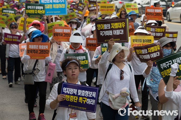 (서울=포커스뉴스) 23일 오후 서울 중구 시청광장 인근에서 보육관계자들이 '어린이집 0~2세 맞춤형보육 제도개선 및 시행 연기'를 촉구하며 가두행진을 하고 있다.