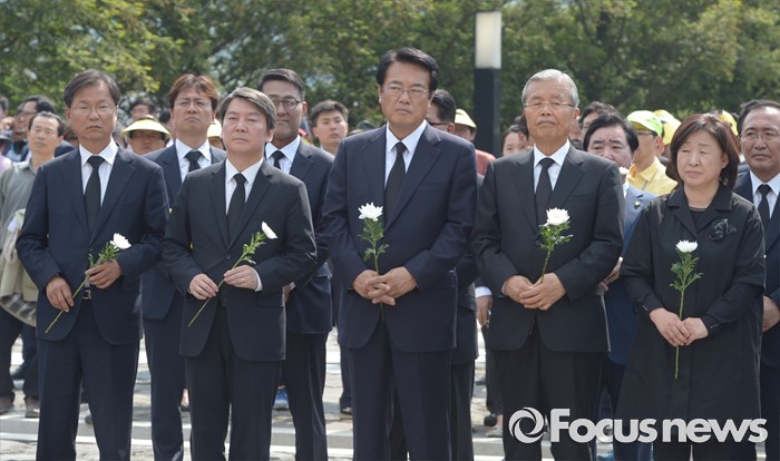 (김해=포커스뉴스) 23일 오후 경남 김해 봉하마을에서 엄수된 故 노무현 전 대통령 서거 7주기 추도식을 마친 뒤 인사들이 묘역 참배 및 헌화를 준비하고 있다. 앞줄 왼쪽부터 천정배 국민의당 공동대표, 안철수 상임공동대표, 정진석 새누리당 원내대표, 김종인 더불어민주당 비대위 대표, 심상정 정의당 상임대표.