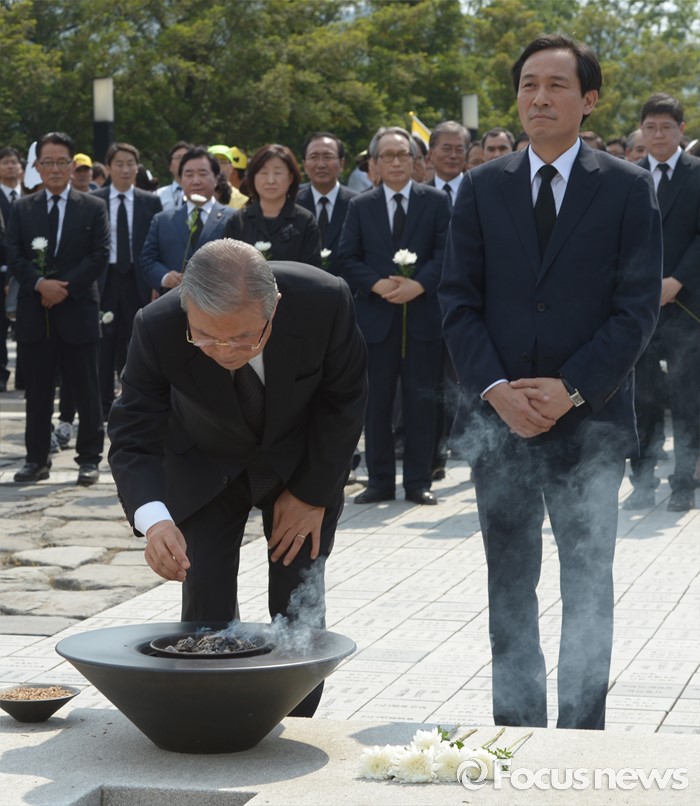 (김해=포커스뉴스) 23일 오후 경남 김해 봉하마을에서 엄수된 故 노무현 전 대통령 서거 7주기 추도식을 마친 뒤 김종인(왼쪽) 더불어민주당 비대위 대표, 우상호 원내대표가 묘역 참배 및 헌화를 하고 있다.