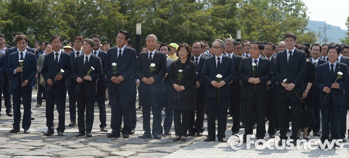 (김해=포커스뉴스) 23일 오후 경남 김해 봉하마을에서 엄수된 故 노무현 전 대통령 서거 7주기 추도식을 마친 뒤 인사들이 묘역 참배 및 헌화를 준비하고 있다. 앞줄 왼쪽부터 김민석 민주당 대표, 천정배 국민의당 공동대표, 안철수 상임공동대표, 정진석 새누리당 원내대표, 김종인 더불어민주당 비대위 대표, 심상정 정의당 상임대표, 이병완 전 대통령 비서실장, 문희상 더불어민주당 의원, 김홍걸 국민통합위원장, 박병석 의원.
