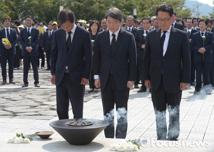 (김해=포커스뉴스) 23일 오후 경남 김해 봉하마을에서 엄수된 故 노무현 전 대통령 서거 7주기 추도식을 마친 뒤 안철수(가운데) 국민의당 상임공동대표, 천정배 공동대표, 박지원 원내대표가 묘역 참배 및 헌화를 하고 있다.