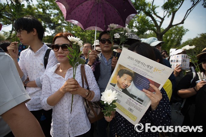 (김해=포커스뉴스)故 노무현 전 대통령 서거 7주기인 23일 오후 경남 김해시 진영읍 봉하마을에서 열린 '故 노무현 전 대통령 서거 7주기 추도식'에서 추도객들이 헌화 순서를 기다리고 있다.