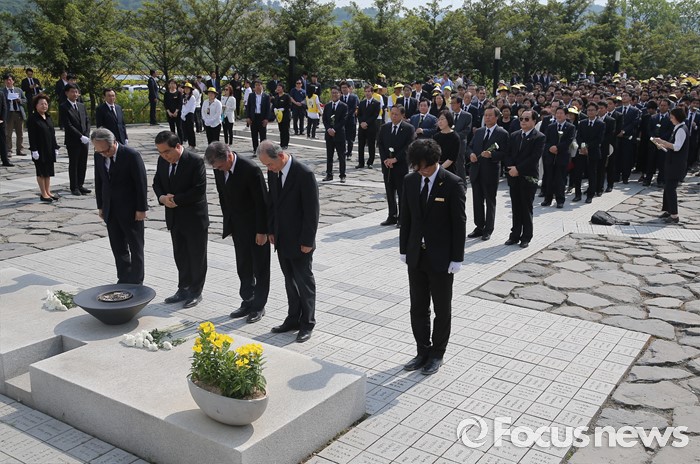 (김해=포커스뉴스) 23일 오후 경남 김해 봉하마을에서 엄수된 故 노무현 전 대통령 서거 7주기 추도식을 마친 뒤 이병완(왼쪽부터) 전 대통령 비서실장, 문희상 더불어민주당 의원, 문재인 전 대표, 고영구 전 국정원장 등이 묘역 참배 및 헌화를 하고 있다.